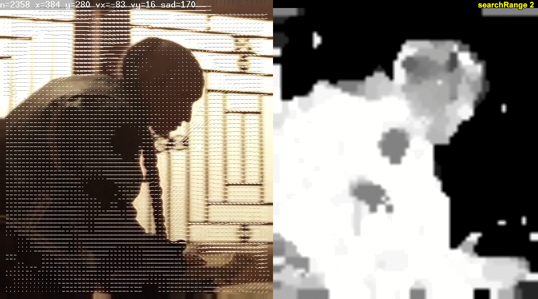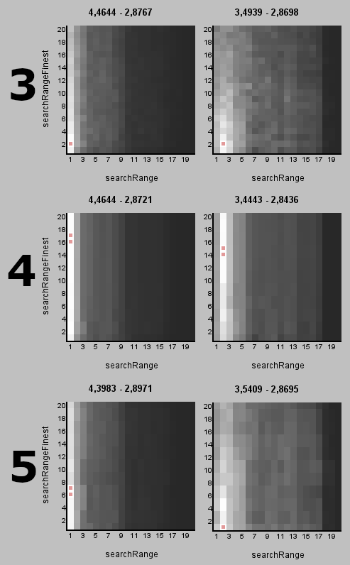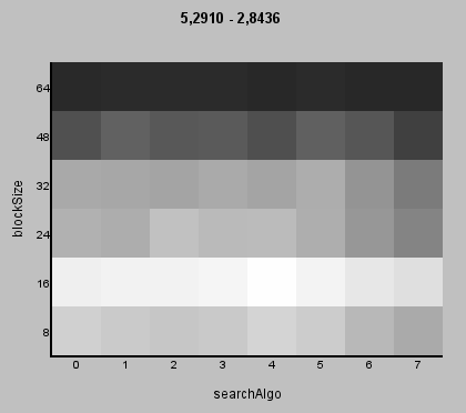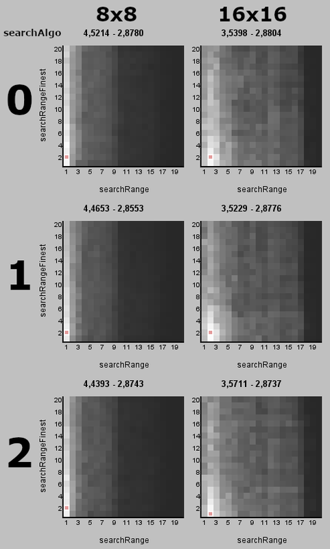 100 000 iterations run 1 run 2 run 3 GMSD 2.8606837 2.8584862 2.8553133 MSuper pel 4 4 4 sharp 2 1 1 rfilter 1 1 1 MAnalyse blksize 8 (LOCKED) search 4 1 1 searchparam 1 1 1 pelsearch 7 2 2 lambda 7 6 3 lsad 18930 932 2084 pnew 241 249 249 plevel 1 0 1 overlap 2 2 2 overlapv 2 2 2 divide 0 0 0 global false false false badSAD 3234 3167 3170 badrange 13 12 12 meander true true true temporal true true true trymany false false false MFlowFPS ml 40 41 41 mask 2 2 2 I was a bit puzzled as to why the optimal searchparam value (which controls the search radius) is very low, just 1 in the 8x8 case and 2 for the 16x16 case. I would have expected that larger radius cannot hurt the results but it looks like it can, and a lot! I did some exhaustive searches around the optimal values just changing searchparam and pelsearch and drew some heat maps for each search algorithm. Results below (note that searchparam is named searchRange and pelsearch is named searchRangeFinest, it controls the search radius at the finest level): ![]() ![]() The brighter the color, the better the GMSD score. The best value is highlighted by a red dot (or dots if there are multiple best results). The decimal numbers above the maps are the worst and the best found GMSD score. This confirms that there is no better alternative to these low search radiuses. This is my guess as to why larger radius doesn't work very well here: The background has a very repetitive pattern and that means there can be very good SAD scores at far away locations. So with a large search range some blocks will get best score at those far away locations and some will find the closest "correct" location and the mixing up of these far/close vectors looks ugly. The following gif demonstates what it looks like with search ranges 2 (optimal), 4 and 8: ![]() Another mystery is that the search algorithm 3 (exhaustive search) was not the best one in either 8x8 or 16x16 case. The docs state that "It is slow, but it gives the best results, SAD-wise". Perhaps there are other factors involved and the best SAD is not all that matters. Algorithm 4 (hexagon search) is a curious case, the pelsearch parameter has very little effect on the result and the best result is at pelsearch 14-17 while with other algorithms it is at around 2 (algorithm 5 is an exception as well). I guess this explains why it was found quite often as the best algorithm. It's also easy to see that with 16x16 blocks it's overall easier to find good results, there is a steep drop to bad results with searchRange > 9 with 8x8 blocks while that dropoff happens at searchRange > 17 with 16x16 blocks. Also the bad results with 8x8 blocks are much worse (around 4,4) than with 16x16 blocks (around 3,5). I have more results to share but that's enough for now.