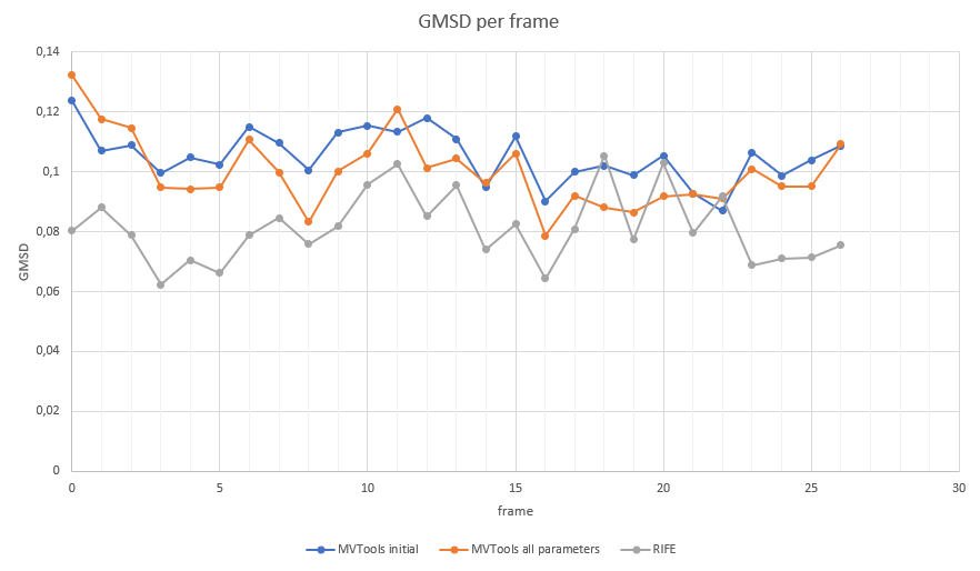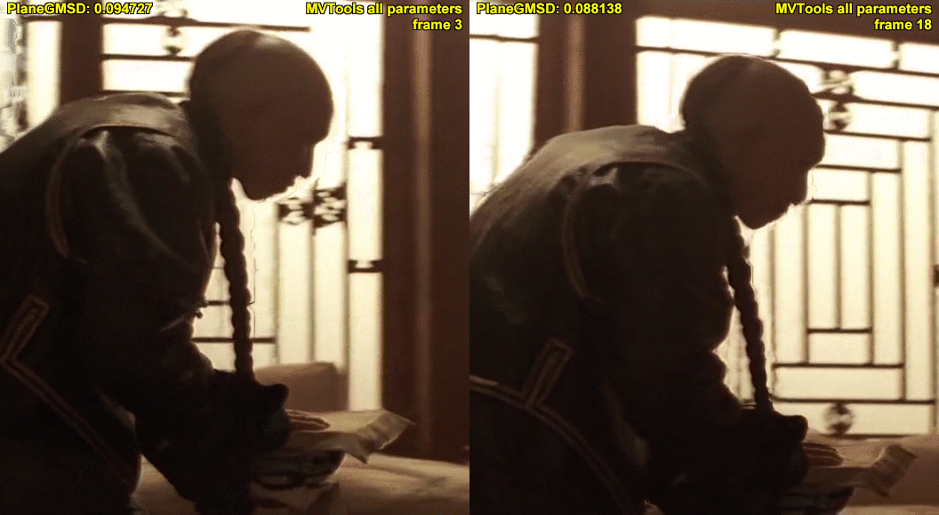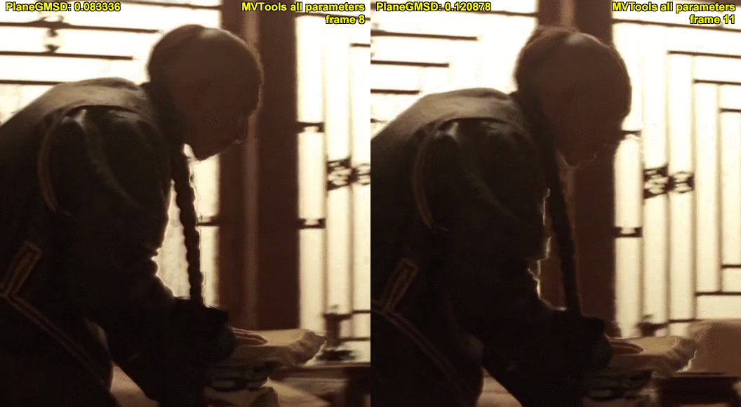 ScaleCSAD and trymany can be seen below as a heatmap. The larger the weight of chroma the better the result. And trymany=true consistently results in worse score. ![]() So how much better is 2.6988451 than 2.843625? What do these values even mean? The script calculates the total GMSD score. There are 27 measured frames so the average per frame is almost precisely 0.01. It's also important to remember that we're measuring the quality after two interpolations while the frame-doubling only needs one so the quality in practical use is perhaps twice better, about 0.005 per frame. I wanted to see how the optimized script compares to RIFE so I did a similar double-interpolation using RIFE ncnn Vulkan with the latest v3.1 model and measured the GMSD. RIFE's total was 2.192934 (NOTE: RIFE works with images and round-trip YV24->png->YV24 gives GMSD penalty of 0.336003). The chart below shows the per frame GMSD scores for the initial version, the latest version with all the parameters and RIFE. ![]() On some frames MVTools actually pulls ahead but RIFE is still better overall. Also notable that the latest MVTools script is actually worse than before on some frames and two worst single frame GMSD scores are from this latest version. We could of course optimize for minimizing the largest per frame GMSD and get different results. Let's compare some frames where the latest script did better (frame 8) and one where it did worse (frame 11). These are the doubly-interpolated frames. ![]() And here's a comparison of the latest MVTools script and RIFE. Frame 3 shows where RIFE is much better and frame 18 shows where MVTools beats RIFE. ![]() Here's the complete MVTools result with score 2.6988451, again only showing the interpolated frames. ![]() The next episode is about MBlockFPS, can it beat the best result of MFlowFPS? |