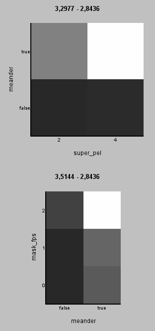 10 000 iterations run 1 run 2 run 3 run 4 run 5 GMSD 3.0752501 2.995727 2.922894 2.9211512 2.9990165 MSuper pel 4 4 4 4 4 sharp 2 1 1 1 2 rfilter 2 2 4 4 1 MAnalyse blksize 24 8 16 16 16 search 3 3 5 3 5 searchparam 6 1 4 5 3 pelsearch 9 9 9 8 13 lambda 11 (99) 20 (20) 10 (40) 6 (24) 22 (88) lsad 7847 10006 5789 6936 10576 pnew 251 180 247 240 254 plevel 2 0 0 2 0 overlap 12 2 0 0 6 overlapv 0 4 4 0 4 divide 2 0 2 2 0 global true true true true true badSAD 8779 1938 1445 8315 6540 badrange 22 7 10 33 11 meander true true true true true temporal true true false true true trymany false false false false false MFlowFPS ml 209 87 50 84 19 mask 2 2 2 2 2 The next phase was running three longer optimizations, 100k iterations each. Code: